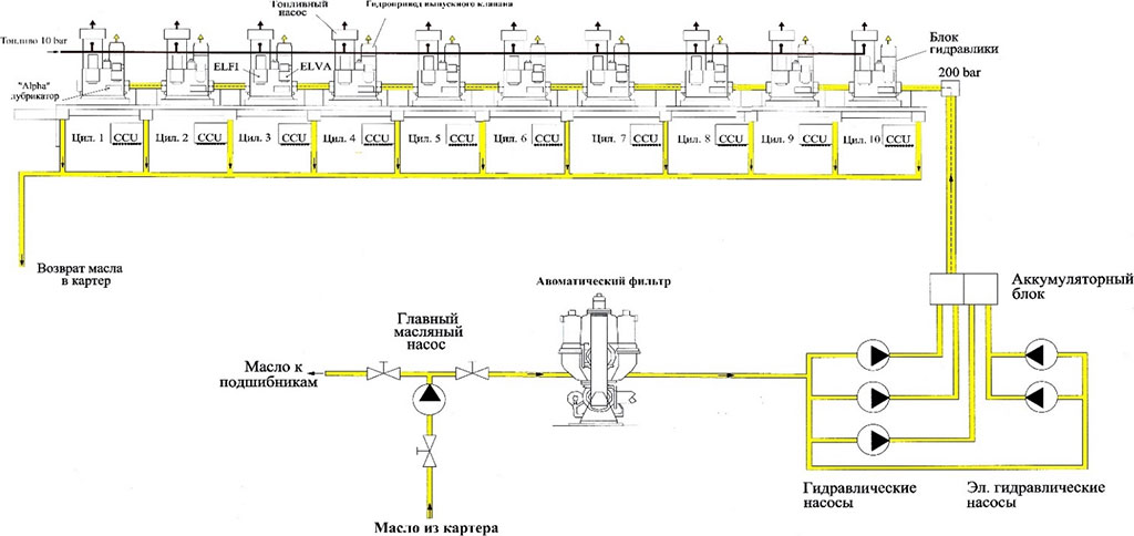 Управление ТНВД, выпускными и пусковыми клапанами в двигателях с электронным управлением серии 50–108 МЕ/МЕ-С осуществляется через блоки управления на цилиндрах CCU (Cylinder Control Unit) снабженные гидроприводами и управляющими клапанами NC.