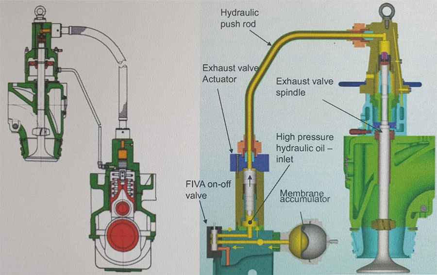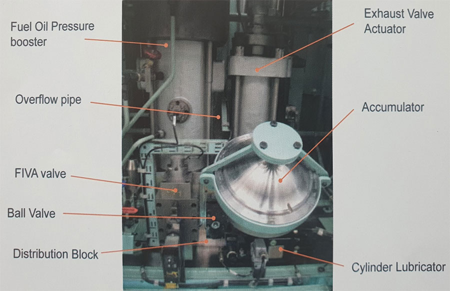 Блоки управления HCU включают в себя аккумуляторы силового масла, распределительные блоки, электронно-управляемые клапаны ELFI (Electronic Fuel Injection) управления подачей топлива и электронно-управляемые клапаны ELVA (Electronic Exhaust Valve Activation) для открытия-закрытия выпускного клапана, гидропривод впрыска топлива и гидропривод открытия выпускного клапана (Exhaust Valve Actuator).
