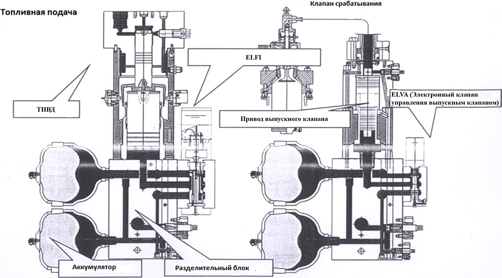 ТНВД, представляет собой сервопоршень и впрыскивающий плунжер. При приеме сигнала от электронной системы управления вступает в действие быстродействующий золотниковый управляющий клапан ELFI, который управляется электрическим линейным электромотором, работающим внутри управляющего устройства. Перемещение золотника открывает доступ силового масла из аккумуляторов к поршню, который соединен с топливным плунжером. Из-за высокого давления масла, действующего на поршень, создается высокая скорость плунжера топливного насоса, в результате чего происходит быстрое нарастание давления топлива перед форсункой и резкий подъем иглы форсунки, приводящий к качественному впрыску топлива под высоким давлением.