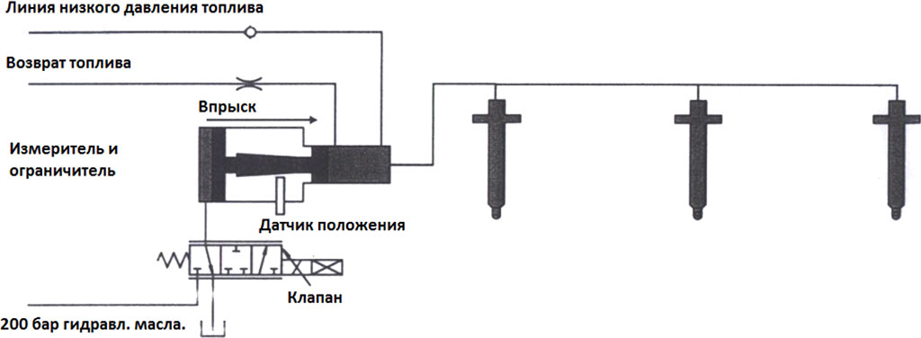 Давление впрыскиваемого топлива поддерживается постоянным за все время открытия иглы. Максимальное давление впрыска топлива порядка 160–200 МПа обеспечивается во всем рабочем диапазоне частот вращения коленчатого вала дизеля. Окончание впрыска происходит также резко, как и начало впрыска. Электронная система посылает сигнал к управляющему клапану который с помощью быстродействующего золотника, моментально его передвигает на слив силового масла. Происходит резкая отсечка впрыска топлива в цилиндр.