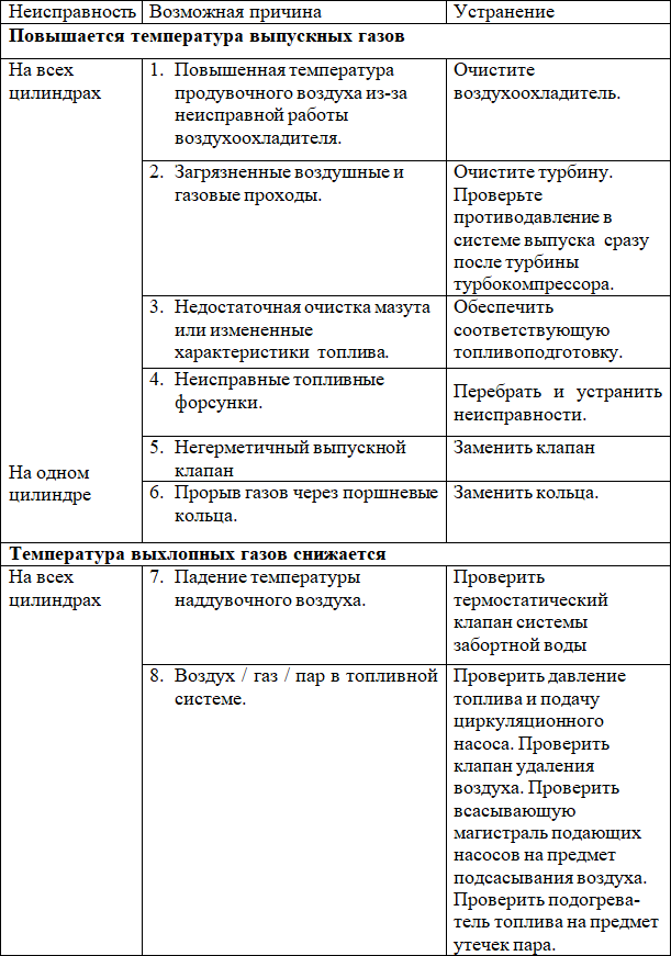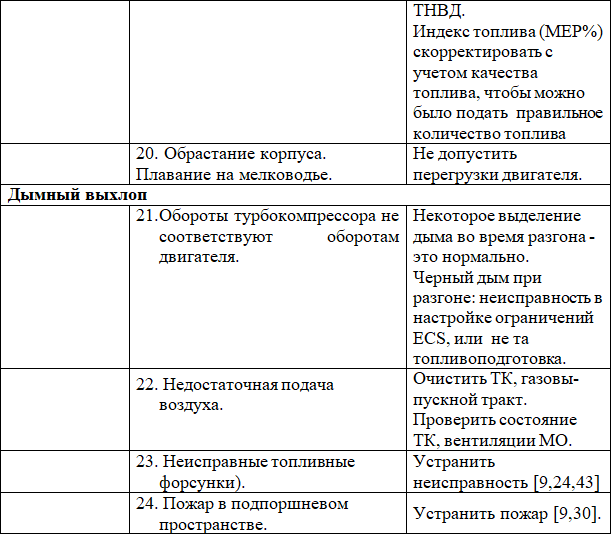 «медленным сгоранием» в цилиндре из-за некачественного распыления, неподходящего распылителя форсунки или «смещения» топливных форсунок; «обратным выбросом» через наддувочные окна из-за большого сопротивления в выхлоп-ной системе. Для поддержания низкого сопротивления выхлопа нельзя допускать скопления сильных отложений на защитных решетках, сопловом аппарате и лопатках турбины, а противодавление после турбонагнетателя не должно превышать нормы.