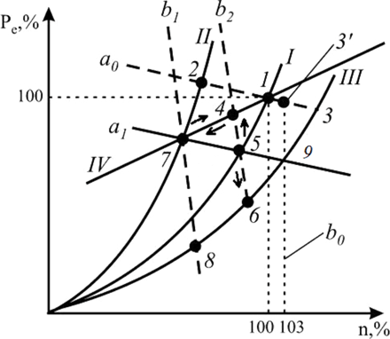При автоматическом регулировании при помощи всережимного регулятора (n = const) изменение частоты вращения будет незначительным, но возможны резкие изменения подачи топлива и, соответственно, нагрузки двигателя. Во избежание больших перегрузок необходимо перейти на пониженную регуляторную характеристику b1 или b2, хотя при этом все равно будут значительные колебания нагрузки, а развиваемая двигателем мощность, будет существенно меньше.