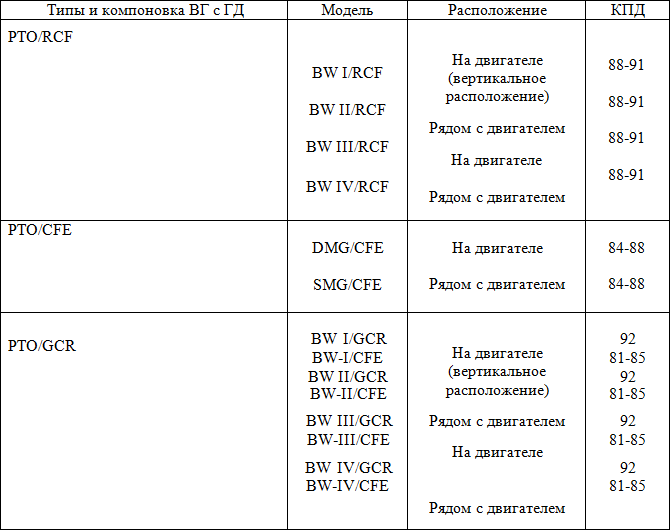 Таблица 2.1. – Схемы компоновки и характеристики систем отбора мощности различными типами ВГ