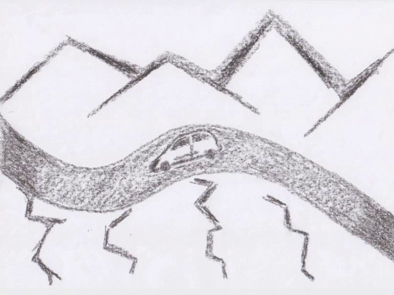 От мамы: «Доехали. Букашка подняла нас так высоко, что внизу виднеются окружённые зелёными горными хребтами белые дома – крохотная деревушка, наполовину скрытая от глаз кронами деревьев. Горные хребты несут крестообразные электрические столбы, под которые подложена тонкая голубая бумага, точно рисовая. Для занятий японской живописью – то что надо. Дочка, правда красиво?!»
