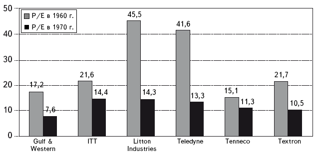 Поскольку 1960-е гг. характеризовались «бычьим» рынком и формированием гигантских конгломератов, появился термин бегущие годы (go go years). Когда в 1969 г. фондовый рынок обрушился, это повлияло на объем рынка поглощений через снижение коэффициентов Р/Е. Рисунок 2.5 демонстрирует, как это падение отразилось на некоторых крупнейших конгломератах.