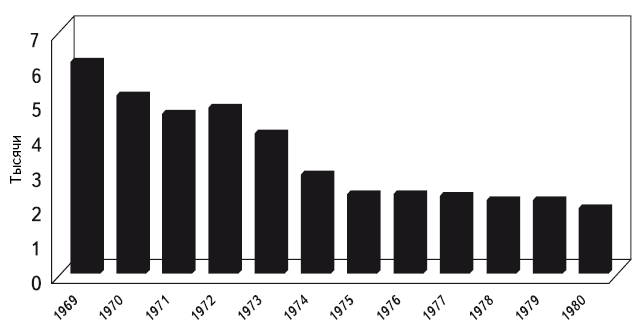 Рисунок 2.6. Количество объявлений о слияниях и поглощениях, 1969–1980 гг.