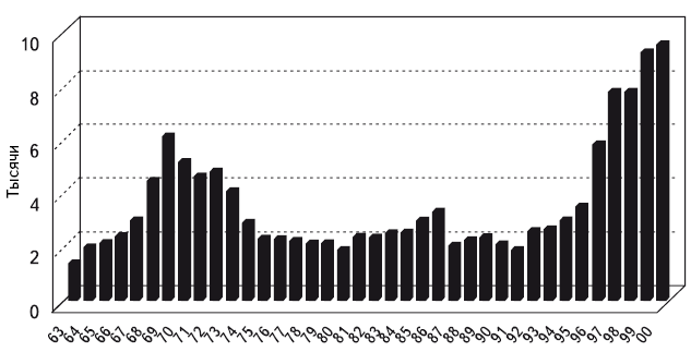 Рисунок 2.7. Количество слияний и поглощений, 1963–2000 гг.