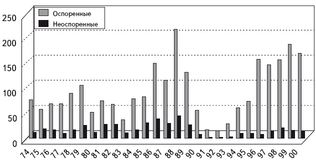 Рисунок 2.8. Тендерные предложения: оспоренные и неоспоренные, 1974–2000 гг.