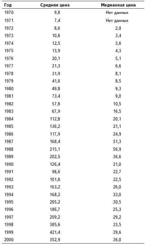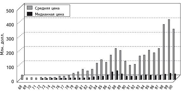 Таблица 2.7. Средняя и медианная цена покупки в США, 1970–2000 гг. (млн. долл.)