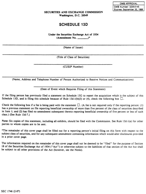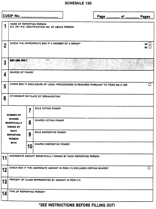 Раздел 13(d) предусматривает подачу формы 13D. Компания должна сдать шесть экземпляров этой формы в SEC в течение 10 дней после приобретения 5 % акций другой компании, находящихся в обращении. Кроме того, один экземпляр должен быть отправлен заказным письмом в штаб-квартиру эмитента ценных бумаг. Еще по одному экземпляру должно быть послано таким же образом каждой из бирж, торгующих этими акциями. На рисунке 3.1 представлена копия формы 13D.