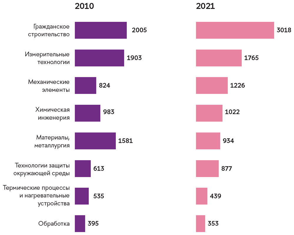 Рис. 4 показывает, как изменилось за 2010–2021 гг. число патентных заявок на изобретения, поданных российскими заявителями в отдельных технологических областях. Среди них наиболее высокий уровень патентной активности в 2021 г. наблюдался в отношении технологий гражданского строительства, защиты окружающей среды и разработки механических элементов. Число поданных российскими заявителями патентных заявок на изобретения, относящихся к области «Материалы, металлургия», напротив, за истекший период снизилось на 41 %.