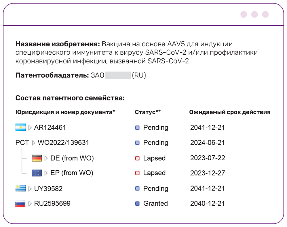** Pending – на рассмотрении, Lapsed – не выдан / с истекшим сроком действия, Granted – выдан.