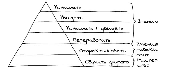 Ну и самый нижний уровень нашей пирамиды – обучение других. Самое время вспомнить бородатый анекдот, где преподаватель сетует на студентов, мол, двадцатый раз вам объясняю, уже даже я, старый, все понял наконец, а вы никак. Надо признать, что это лишь отчасти анекдот. Думаю, ты сможешь вспомнить ситуацию, когда ты, узнав что-то новое, пытаешься объяснить это кому-то другому и только тут осознаешь, что сам сначала многого не понял. Зачастую через объяснение чего бы то ни было человек сам начинает лучше понимать материал. Конечно, наибольший эффект достигается, когда этот материал он уже успел попробовать на практике, то есть двигался по пирамиде последовательно.