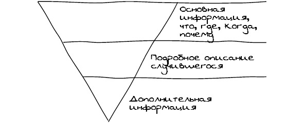 Обычно основная идея пирамидальных концепций состоит в том, что есть уровни, они последовательны, и мы стремимся к самому верхнему или иногда нижнему, а переходить к следующему стоит, только разобравшись с предыдущим. Но и в случае с пирамидами креатив никто не отменял. Вот, например, перевернутая пирамида копирайтинга Б. Минто, дающая понимание того, как стоит писать статью (рис. 12). Эту пирамиду лучше изображать именно так, чтобы не возникало ассоциации со стремлением к верхнему уровню, как апогею желаемого. Площадь каждого уровня символизирует количество уделяемого ему внимания, а также объем отводимого текста.