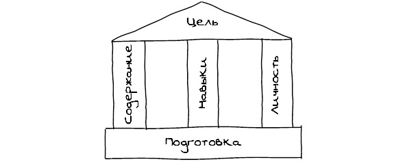 Еще одним распространенным образом, полюбившимся тренерами, является эдакий домик. Что нужно, чтобы классно публично выступать (рис. 15)? В фундамент заложим подготовку, а цель обозначим в качестве крыши. Тогда само выступление будет базироваться на трех колоннах: содержание речи, навыки оратора и его личность.