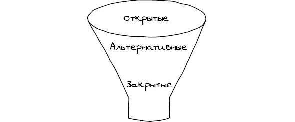 Сначала клиенту задаются открытые вопросы, они начинаются с вопросительных слов (что, как, где, куда) и позволяют получить максимум информации. «Что для Вас важно при выборе телефона/туфель/туалетной бумаги…?». Иногда клиент не может четко сформулировать свой запрос и мы переходим к альтернативным вопросам: «Вы себе или в подарок?», «Вам надолго или на один раз?», «Для Вас важнее внешний вид или начинка?» и т. д. И есть закрытые вопросы, предполагающие односложный ответ «да» или «нет», они задаются либо для конкретизации («Правильно ли я Вас понял…»), либо в качестве конкретного предложения («А хотите взглянуть на нашу новинку?»). Воронкой любят отображать также поток клиентов, от сотен, зашедших на сайт (горло воронки) до нескольких купивших (устье воронки). Тогда можно поискать, в каком месте эта воронка уже, чем должна быть. То есть, у нас может быть хорошая реклама, поэтому люди активно заходят к нам на страницу, у нас хорошие консультанты, поэтому большинство звонящих покупает, но процент этих звонящих по отношению к посетителям сайта критически мал. Значит, наш сайт плохо продает, это и есть то узкое место воронки, которое мы искали.