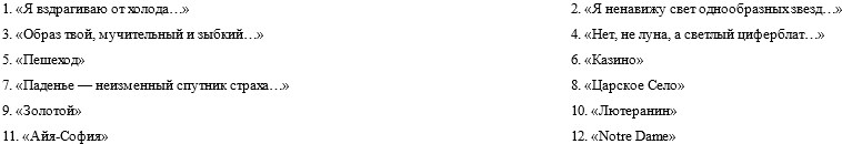 Итак, в пределах 1912 г. стихи «Камня» могут быть поделены на шесть пар, в каждой из которых стихотворения образуют контраст и одновременно связаны друг с другом: