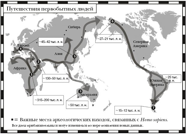 К тому времени когда современные люди в первый раз стали заселять Европу, – около 45 тысяч лет назад, – охотники-собиратели уже дошли до Тихого океана. Считается, что они мигрировали на восток тремя отдельными родовыми группами: одна продвигалась в районе бассейна реки Амур между северо-востоком Китая и Россией, другая – по высокому Тибетскому нагорью к северу от Гималаев, а третья – через Юго-Восточную Азию.