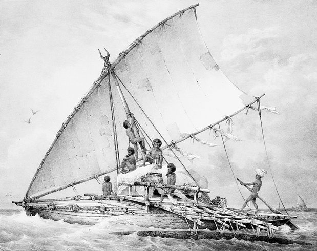 Древнее судно с аутригерами и парусом «клешня краба». Австронезийское морское дело быстро развилось в целый ряд характерных форм (картина Луи Ле Бретона, 1846 г.)