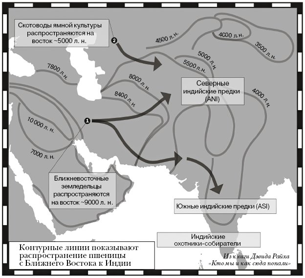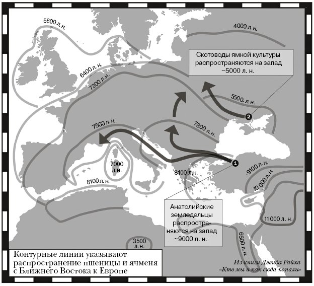 Переход к оседлости и земледелию на Европейском и Индийском субконтинентах происходил похожим способом. Около 9–10 тысяч лет назад в оба эти региона прибыли земледельцы с Ближнего Востока. Они смешались с сильно непохожими на них группами охотников-собирателей и принесли им качественно новые технологии. В Индии такие пришедшие с запада зерновые культуры, как пшеница и ячмень, выращивались так, чтобы совладать с муссонным климатом, и постепенно распространились по всему субконтиненту. Спустя несколько тысяч лет китайские зерновые – рис и пшено, независимо выведенные в бассейнах рек Янцзы и Хуанхэ, – тоже добрались до Индии. Таким образом, местная сельскохозяйственная система сложилась в результате столкновения ближневосточных и китайских техник. Далее земледелие распространилось по суше через Восточную Азию во Вьетнам и Таиланд и морскими путями – на Тайвань.