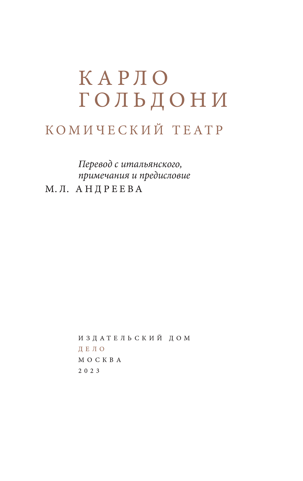 «Комический театр» уже переводился на русский язык А. В. и И. В. Амфитеатровыми (без посвящения и обращения автора к читателям), см.: Гольдони К. Избранные сочинения / под ред. А. Л. Волынского. Пг.: Госиздат, 1922. Т. 1. Перевод в целом точный, вплоть до буквализма, который в некоторых случаях переходит через допустимую грань, например, когда «i loro concetti» (барочные метафоры) передаются словом «концепции», а «commedia a soggetto» (комедия импровизации) становится «комедией сюжета»[5]. Настоящий перевод выполнен по изд.: Goldoni C. Tutte le opere / A cura di G. Ortolani. Milano: Mondadori, 1959. Vol. II. P. 1039–1105. Перевод предисловия Гольдони к первому собранию сочинений выполнен по изд.: Goldoni C. Memorie / A cura di P. Bosisio. Milano: Mondadori, 1993. P. 757–773.