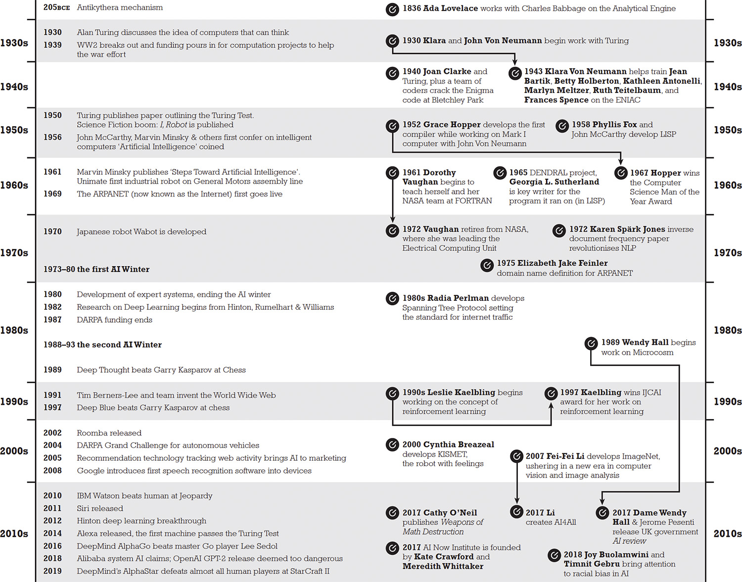I’ve ordered this chapter as a timeline of individuals, but it’s really important to note that the history of AI, as any history of innovation, is never that straightforward. The history of computing in particular is often documented as a series of male geniuses appearing one after another, which simply isn’t the case. So often when history is told as ‘a series of geniuses’, women, particularly women of colour, are erased from the narrative. Among the many reasons for this is the big one: traditionally, the people writing history are the same people who hold the power – white men. When new inventions or ideas shake up our way of thinking or doing, it’s always a result of many people working together, forming communities and pushing things forward – not just one individual, inspired though they may be. So please remember as you read this that it’s networks of people, not individuals on their own, who’ve brought us to where we are today.
