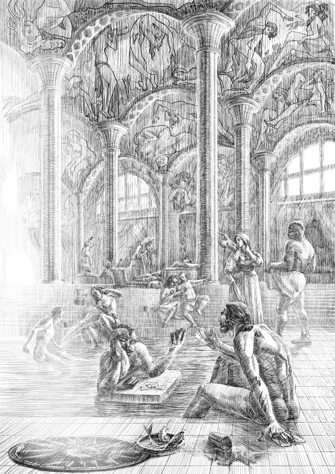 Так или иначе, в здании имелось несколько небольших залов, которые плиткой, мрамором, фресками, чистотой и комфортом едва ли отличались от тех, что находились в купальнях в центральных квадратах города. Были там два бассейна, парильные кабинеты, комнаты для массажа и грязевых процедур, альковы для развлечений. Эти залы не предназначались рабочим, лишь изредка в пьяном угаре рассуждавшим, что здание снаружи кажется больше, чем есть на самом деле. Именно в этой части купальни содержалась ее суть и причина строительства. Она была местом встреч.
