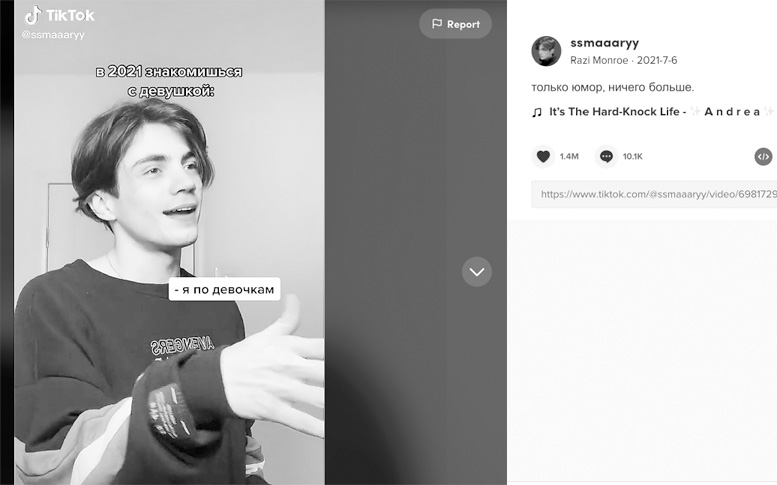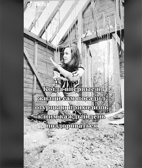 Юлька Шпулька[28] каждое событие превращает в танец. В ее блоге нет разговорного контента, а сценки – большая редкость. Кажется, что она танцует всю жизнь, где бы ни находилась: в метро, на пляже, на балконе, в ресторане или около урны. Юлька вовлекает в танцы случайных прохожих. На ее позитивный контент подписываются миллионы со всего мира. После введения TikTok ограничений ее телеграм-канал вырос до 250 тысяч подписчиков.