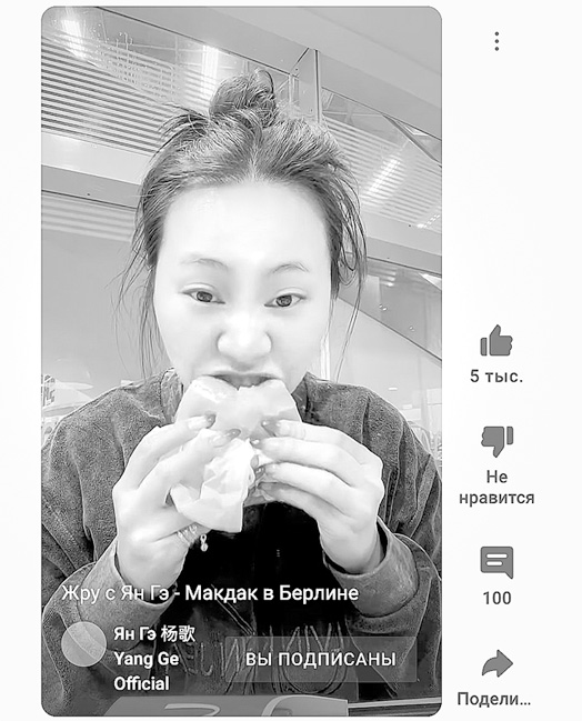 Китайская актриса и певица Yang Ge[18] редко живет больше суток без постов. Она ведет несколько постоянных рубрик. Ян Гэ жалуется на трудности освоения языка в рубрике «Невыносимый русский язык». Не реже появляются выпуски «Жру с Ян Гэ».
