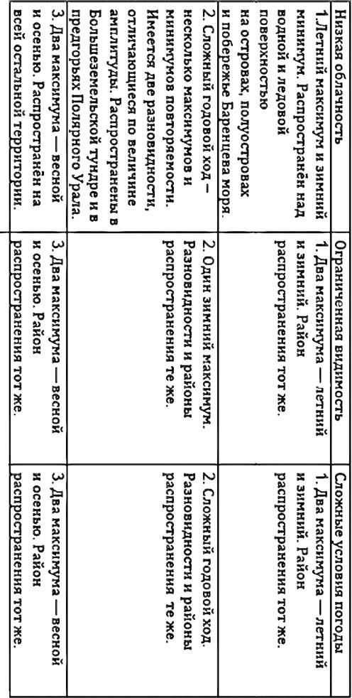 Для выявления авиационно-климатических районов на территории Европейского Севера был применён метод районирования, в основу которого положен характер годового хода повторяемости низкой облачности, ограниченной видимости и их комплекса сложных метеоусловий, а также отношение их суммарной продолжительности тёплого периода к холодному. В результате анализа материалов наблюдений (главным образом, графиков годового хода) были выявлены основные типы и разновидности годового хода низкой облачности 200 м и ниже, ограниченной видимости 2 000 м и менее и их комплекса сложных условий погоды М (2/200) и менее. Все типы и разновидности указанных метеорологических элементов и комплекса, которые были подробно рассмотрены выше, сведём в таблицу.