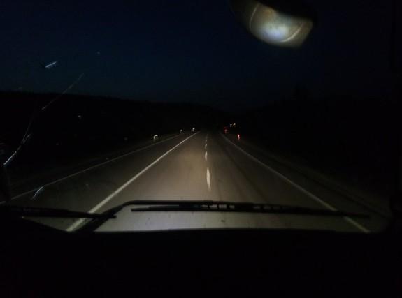 Фонари на фуре бьют далеко и ехать ночью намного комфортнее и безопаснее, чем на той же легковушке (которые обычно пристраиваются в ряд за фурой и едут хвостиком, особенно в туман). По пути видели несколько косуль вдоль дороги (их глаза ярко блестят в темноте, отражая свет фар), несколько зайцев, перебегающих дорогу, и браконьеров. Нет, их глаза не светились в свете фар – они сами охотились на тех самых косуль "на фару" – высвечивая глаза в лесу мощным прожектором и стреляя. Нерадивые охотники.