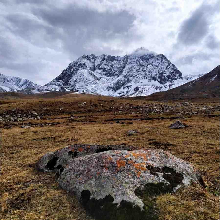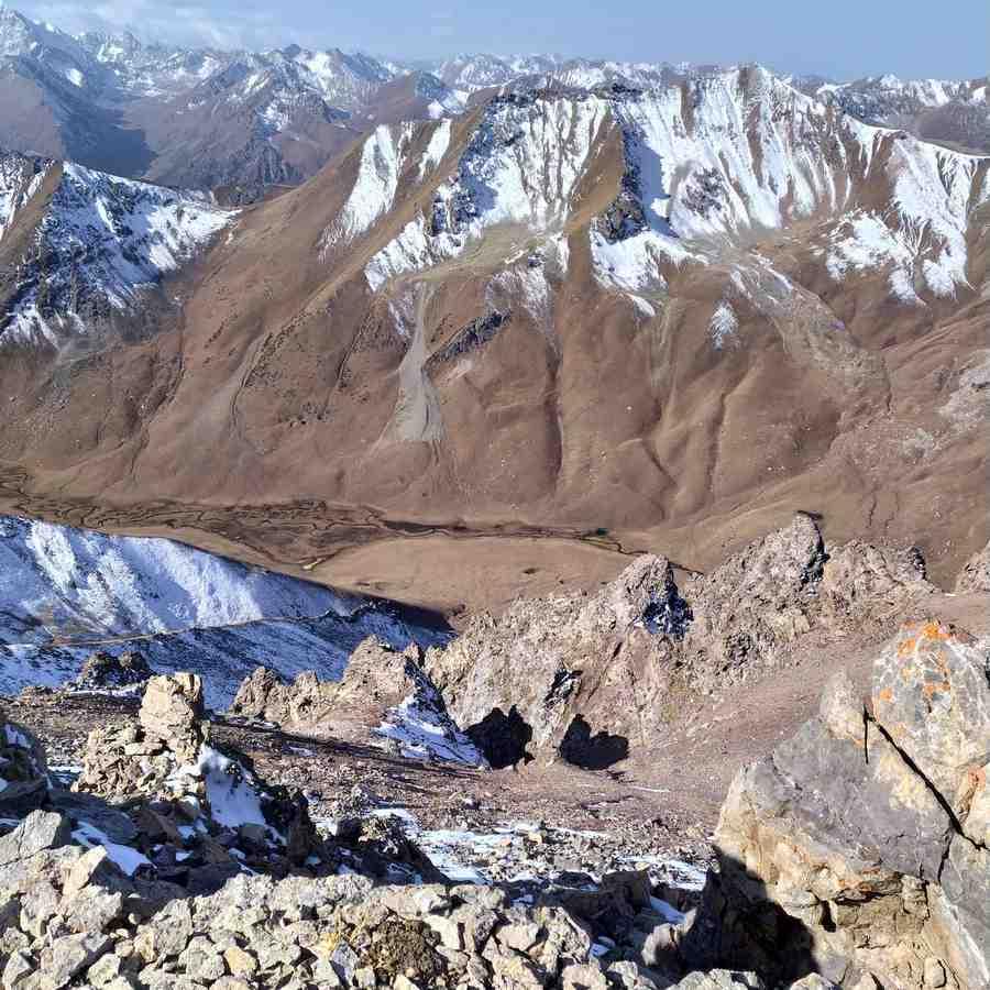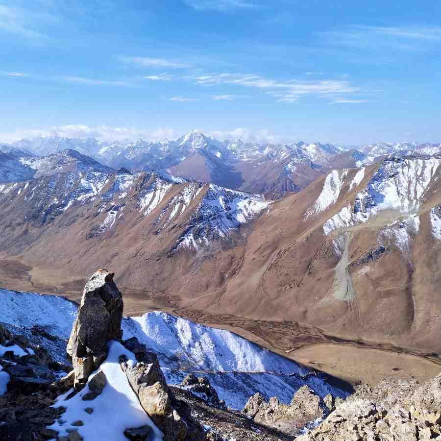 Не без усилий, но я поднялся на хребет, откуда мне удалось наконец-то увидеть горный Тянь-Шань во всей его красе. Неподалеку могущественно возвышался пик Таштамбектор-Баши, высотой около 4463 метров, а за ним – пик Каракол, 5216. Я же находился чуть ниже – порядка 3700 метров, но и этого было достаточно, чтобы ощутить силу и первозданность этих мест. Отсутствие туристической тропы лишь усиливало эти ощущения, придавая дух первооткрывателя.