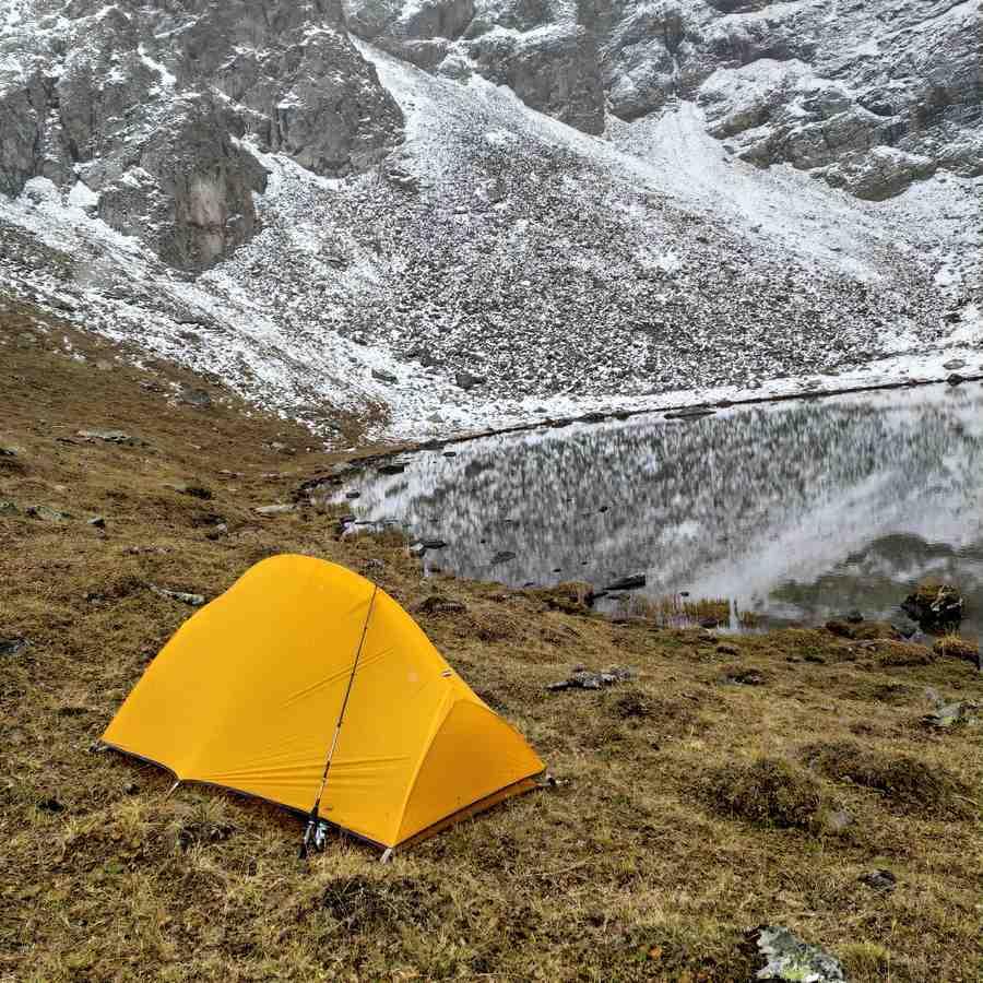 Меньше чем за 3 часа я дошел до подножия горы, где и обнаружил долгожданное озеро о котором мне говорил Нурсултан, но сил на рыбалку уже не оставалось. Холод и непростая дорога под рюкзаком порядком измотали меня. Стоило только поставить палатку и ненадолго укрыться от ветра, как я заснул крепким сном младенца.