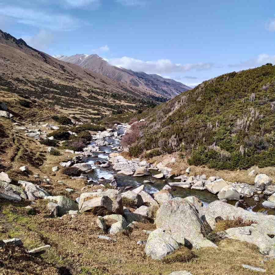 За перевалом меня уже ждала река Тургенаксу, что брала свое начало где-то у подножий одного из пиков, что я видел ранее – Таштамбектор-Баши, но до нее еще требовалось спуститься. Ноги ощущались как ходули, но нельзя было расслабляться, поскольку большая часть происшествий случается именно на спуске, когда человек чувствует, что самое сложное уже позади. В этот раз спуск не представлял особой сложности, видно было, что здесь частенько ходит скот. Так для меня под рюкзаком – это исследование и приключение, а для кого-то – рутинная повседневность.
