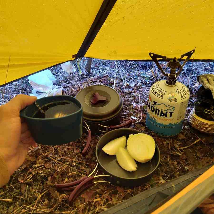 Проснулся уже ближе к вечеру, обошел озеро по кругу, пытаясь хоть что-нибудь поймать в кристально-чистой воде. Спиннинг не показал никаких результатов. Тогда я приготовил себе старую-добрую гречку и отложил рыбалку на следующий день. Может с новыми силами что-нибудь да получится. Начался снег, стало холодать. Я залез в оба спальника, а ноги погрузил в закрытый рюкзак, чтобы ничто не могло отлучить меня от долгожданного сна. Good night!