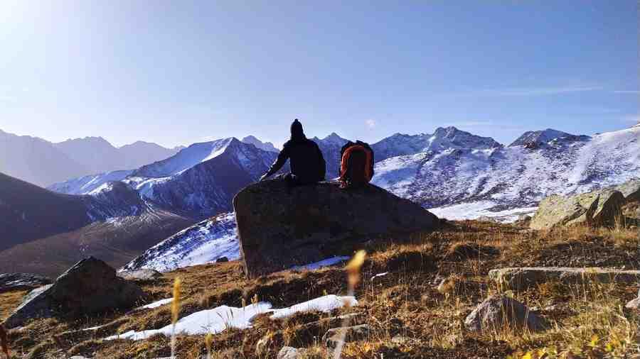 Дождавшись, пока солнце хоть немного прогреет воздух, я собрал лагерь и продолжил свой путь на вершину хребта. По началу мне казалось, что мои легкие дышащие кроссовки станут проблемой для подобного восхождения, ведь никто и не думал проектировать их с учетом прогулок по колено в снегу, но опасения не оправдались. Когда я поднялся выше 3000 метров – началась большая снежная «шапка», где я и убедился в том, что тропить ступеньки можно и в легкой обуви, пусть и не с такой простотой, излишняя упругость подошвы компенсировалась весом. Не зря говорят, что в горах каждые 100 грамм, особенно на ногах, ощущаются как полноценный килограмм. Да, двигаться приходилось быстрее, чтобы ноги надолго не оставались в снегу, но обилие здоровых валунов решало и эту проблему, выступая чем-то вроде “островков безопасности”, где можно было перевести дух и согреться.
