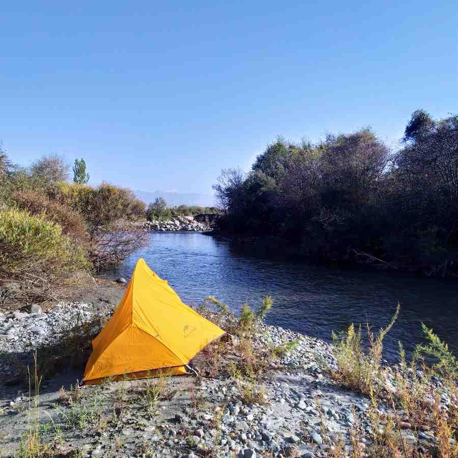 Большую часть пути я проехал с парнем по имени Султан, что никак не мог поверить в мои планы, но оживленно рассказывал о лучших местах на побережье. Я вышел из машины чуть дальше поселка Тамга, что он так рекомендовал. Неподалеку в озеро впадала речушка, вода которой оказалась для лагеря очень кстати.