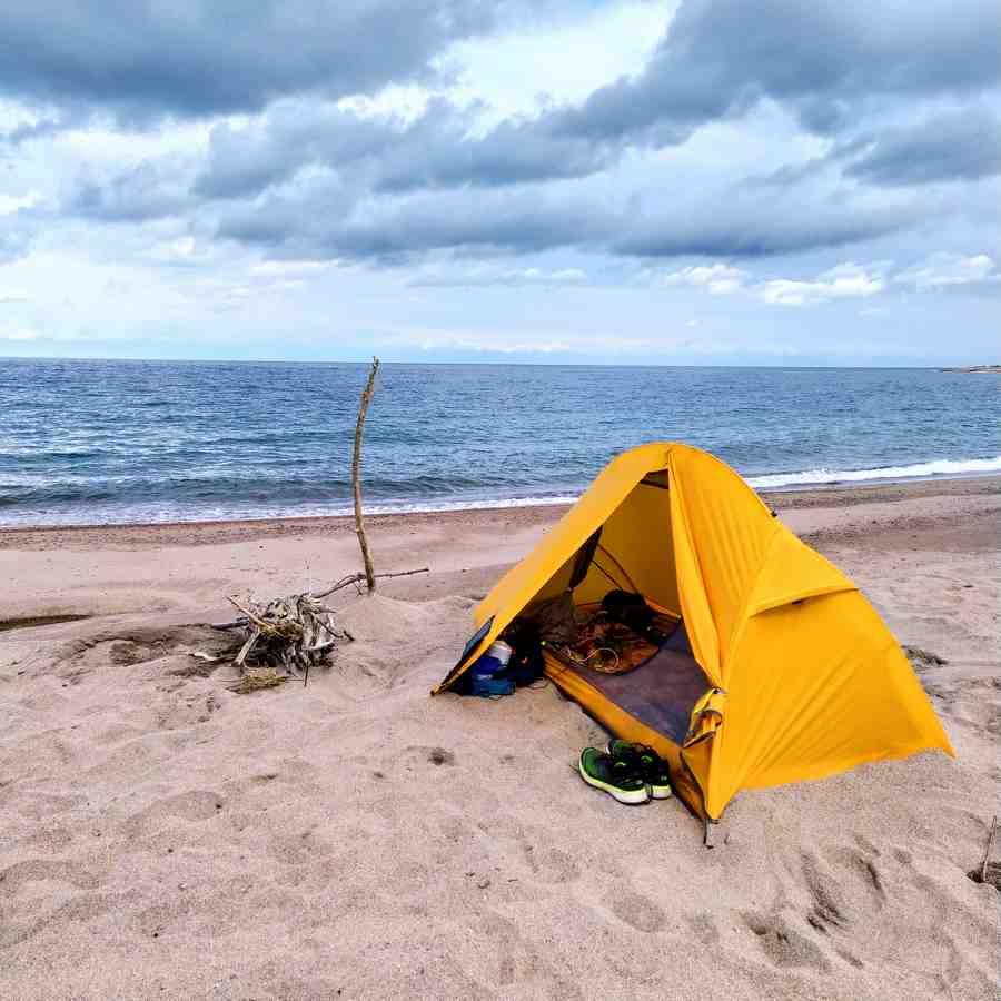 На утро я обнаружил интересную деталь, речушка, что впадала в озеро – изменила свое русло за ночь, волна намыла небольшой островок песка, чем перекрыл прежний путь реке. Да и озеро обрело совсем иной вид, если вчера «могучий великан» спал, то сегодня ветер то и дело пытался его разбудить, раскачивая волну. Мне даже пришлось переставить палатку торцом по направлению к воде, чтобы скаты тента не принимали на себя удар стихии. Поглубже присыпав тент, я смог наконец-то расслабиться, пока солнечная панель пыталась вытянуть хоть лучик света для зарядки телефона.