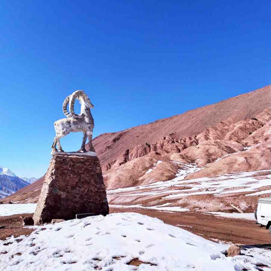 Когда мы добрались до финального перевала Кызыл-Арт, за которым лежал одноименный пропускной пункт, дорогу окружил снег, 4202 метра – это уже не шутки! Подъем по серпантину представлял собой смесь мерзлой щебенки, воды и снега, но для нашего вездехода сложности не представлял, медленно, но верно мы забрались на самый верх. Нас встретила огромная стела со статуей горного барана, говорившая о том, что мы стоим у самого входа на «крышу мира», именно так переводится «Па-мир». Когда-то люди считали это место самым высоким в мире, еще не зная о высоте Гималаев.