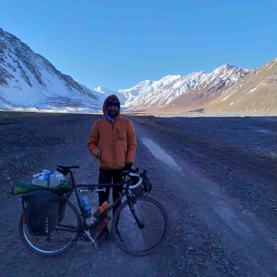 В своих размышлениях я даже не заметил, как со мной поравнялся велосипедист. Он слез со своего коня и мы познакомились, медленно продолжив идти дальше. Ветер то и дело швырял песок прямо в лицо, но это не могло помешать нам поговорить и лучше познакомиться. Парня звали Джордан, он уже который месяц ехал от самой Франции, а теперь направлялся в Китай! Интересно все-таки устроена наша жизнь, если бы я вчера миновал перевал, то мы вряд ли встретились бы, поскольку я бы мог уделить отдыху больше времени, не выходя на дорогу, а тут – приятная встреча, заряжающая обеих энергией. Еще один пример эффекта бабочки, даже неприятные события в последствии становятся частью каких-то крутых историй или знакомств.