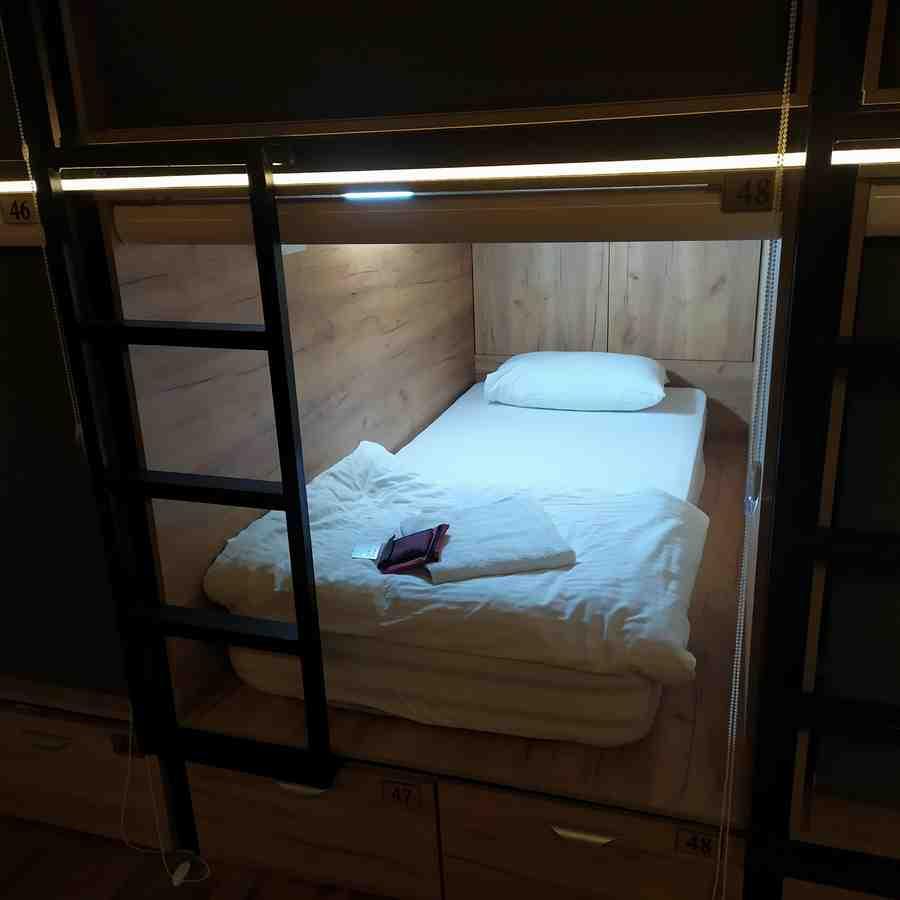 Отдельно порадовал хостел, что находился в самом центре города и представлял собой отель капсульного типа, по типу японских. Больше 300 «капсул-комнат» в подвале отеля позволяют иметь свой уголок с кроватью, тумбочкой внутри, розетками и светом, а снаружи закрываются на замок. Вся эта «радость» стоит каких-то 250 рублей за ночь – можно жить довольно долго без проблем.