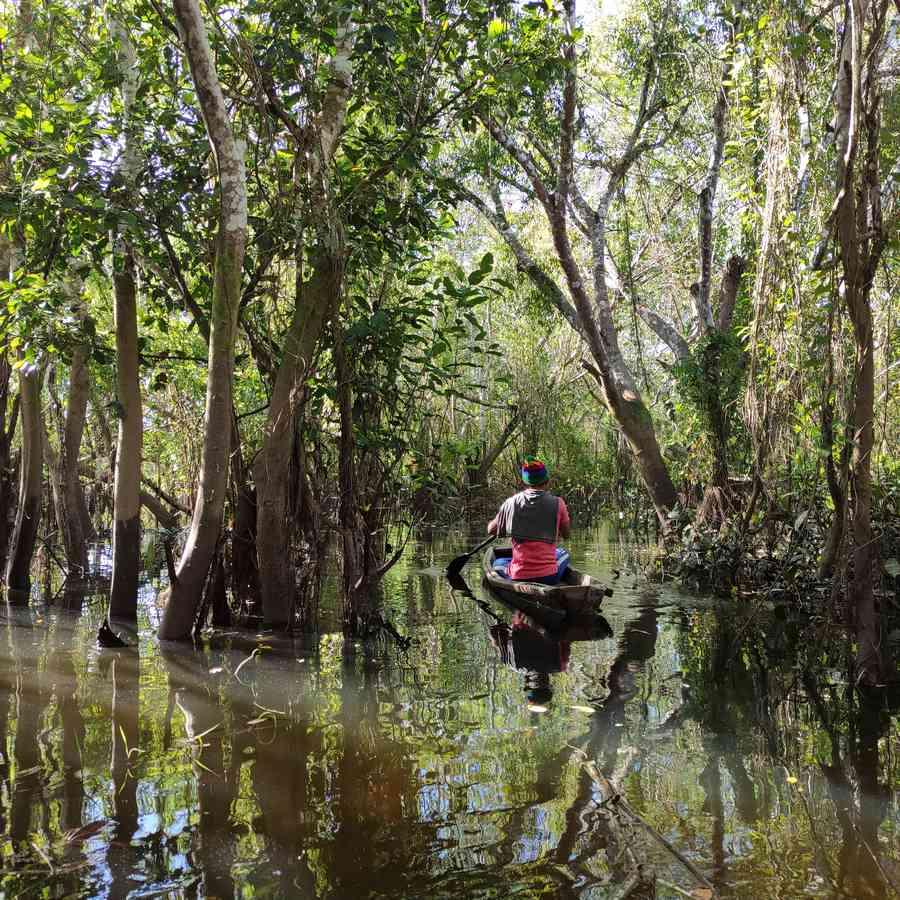 Мы заходим вглубь этого мангрового леса с кристально чистой водой и находим два каноэ – одно его, а второе его друга, который вернётся для рыбалки только вечером. Мне было оказано доверие воспользоваться одним каноэ, чему я неимоверно обрадовался. Это настоящее долблёное каноэ! В длину не больше 2 метров. Кое-как усаживаюсь внутрь и сразу понимаю, насколько оно неустойчиво и манёвренно. С ним в комплекте идёт весло. Хонас показал, что одной рукой нужно держаться за головку весла, а другой – грести.