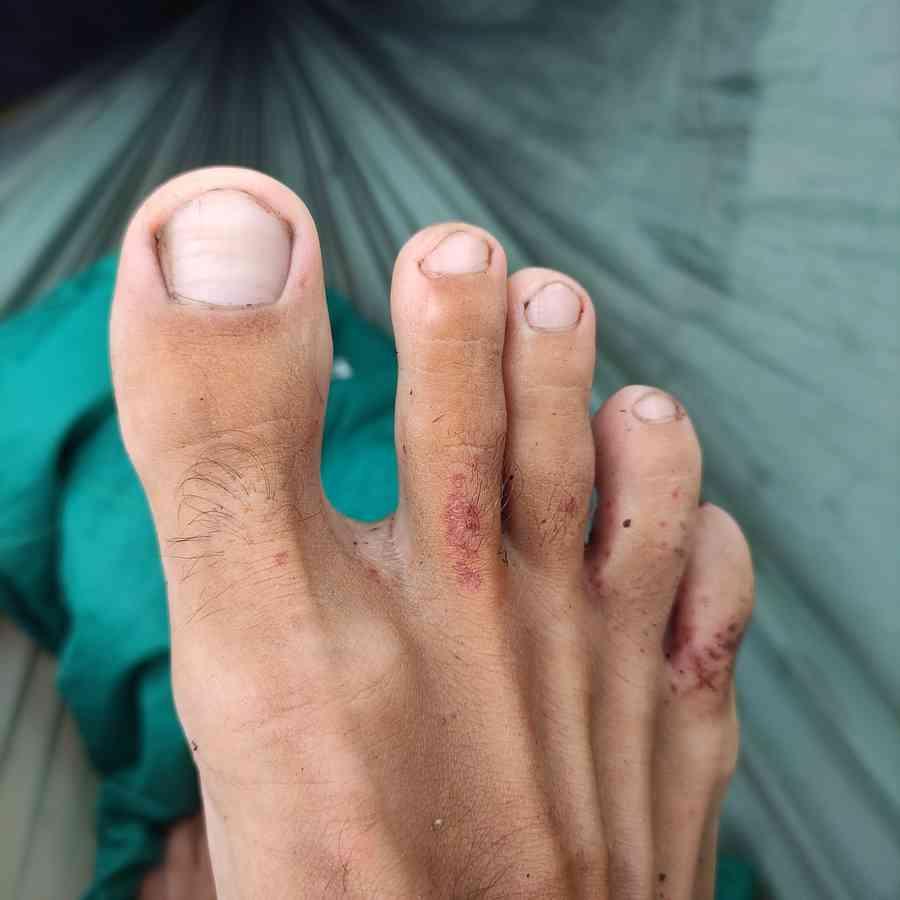 Нога всё так же болит. Всё-таки натер мозоли водой в сапогах. На ступнях появились оголенные участки плоти без кожного покрова в виде сантиметровых кружков, а между пальцами кожа и вовсе местами отслоилась. Дождь усугубляет. При попадании воды на эти раны всё начинает болеть. Переживаю.