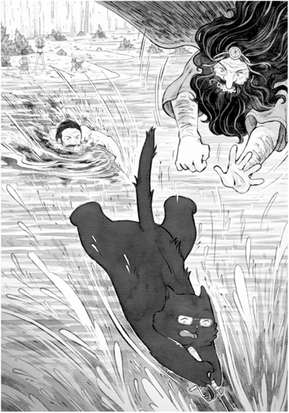 Через несколько волнительных минут дрожащий Хантер стоял на берегу: тэнгу успел подхватить его в последнее мгновенье перед тем, как кот был готов окончательно уйти под воду, и вернулся с ним к друзьям на берег. Все радовались и обнимали спасённого Хантера, которого пришлось ещё и подбадривать, поскольку кот больше всего сейчас сетовал не о том, что мог утонуть, а о том, что упустил крупную рыбу.