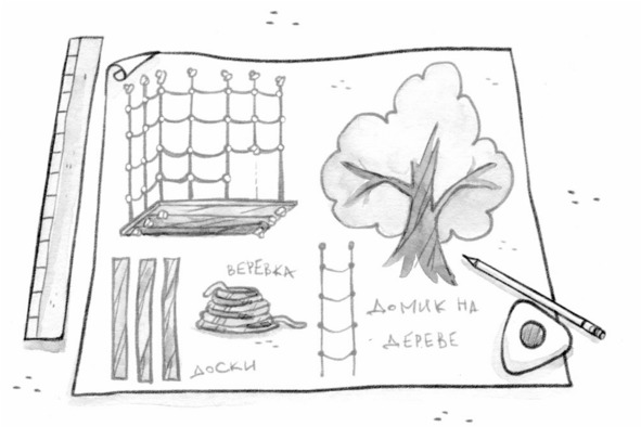 – Нам предстоит непростое дело, – сказал Макс. – Сначала надо набросать план, а потом уж и строить. Думаю, что на самой толстой ветке надо соорудить деревянный настил для пола, а стены сплести из веревок и прикрепить их к верхним веткам.