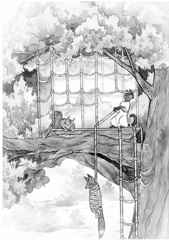 Лисенок бросился за ней. Около самого дерева Матильда внезапно развернулась и прыгнула ему под ноги. Лисенок завалился на бок, и в этот момент на него упал моток веревки, сброшенный Томом. Матильда схватила зубами конец веревки и опутала ею ноги зверька, да так быстро и крепко, что он и сам не понял, как очутился в плену у бесстрашных котиков. Они затащили его наверх, и Матильда громко закричала: