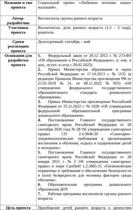 В связи с этим, был разработан социальный проект для детей раннего возраста «Любимые потешки наших малышей» (для детей от 1,5 до 3-х лет). Он полностью соответствует цели и задачам ФОП ДО.