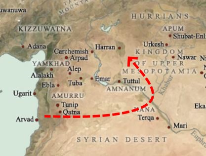 После получения благословения и обещания защиты от Б-га Иаков продолжает свой путь в Харран и приходит в страну сынов Кедема. В 1600 году до н. э. царь хеттов Мурсили I захватил и полностью разрушил государство Ямхад. Ицхак был союзником Ямхада, и это делало невозможным прохождение его сына по вражеской территории через Эмар или Титтуль. Иакову пришлось направиться через земли Ишмаэля – часть государства Мари, ранее захваченную Вавилоном. Кедем был сыном Ишмаэля, и к нему Авраам направил своих сыновей от Катуры перед своей смертью. Имя Кедем происходит от аккадского слова kidam и переводится как ‘снаружи’. Если объединить всю информацию, получается, что «страна сынов Кедема» – это земля, находящаяся на северном берегу Евфрата. Это также не противоречит обещанию, данному Б-гом вначале Аврааму о том, что его потомки будут занимать территорию от южного берега Евфрата и до реки Мицраима, и после Иакову, что он займет территорию по направлению к Кедему, то есть до южного берега Евфрата. Как показано на рисунке ниже, Иаков покинул Беэр-Шеву и отправился через Катну в Терку. Далее он поднялся по притоку Евфрата Хабуру, в долине которого еще со времен Зимри-Лима пасли стада населявшие Месопотамию народы, и оттуда направился в Харран.
