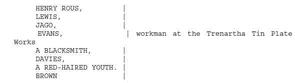 The action takes place on February 7th between the hours of noon and six in the afternoon, close to the Trenartha Tin Plate Works, on the borders of England and Wales, where a strike has been in progress throughout the winter.