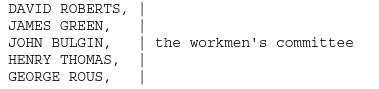 TENCH. [Looking for the CHAIRMAN'S assent, reads in a rapid and monotonous voice.] "At a Board Meeting held the 31st of January at the Company's Offices, 512, Cannon Street, E.C. Present – Mr. Anthony in the chair, Messrs. F. H. Wilder, William Scantlebury, Oliver Wanklin, and Edgar Anthony. Read letters from the Manager dated January 20th, 23d, 25th, 28th, relative to the strike at the Company's Works. Read letters to the Manager of January 21st, 24th, 26th, 29th. Read letter from Mr. Simon Harness, of the Central Union, asking for an interview with the Board. Read letter from the Men's Committee, signed David Roberts, James Green, John Bulgin, Henry Thomas, George Rous, desiring conference with the Board; and it was resolved that a special Board Meeting be called for February 7th at the house of the Manager, for the purpose of discussing the situation with Mr. Simon Harness and the Men's Committee on the spot. Passed twelve transfers, signed and sealed nine certificates and one balance certificate."